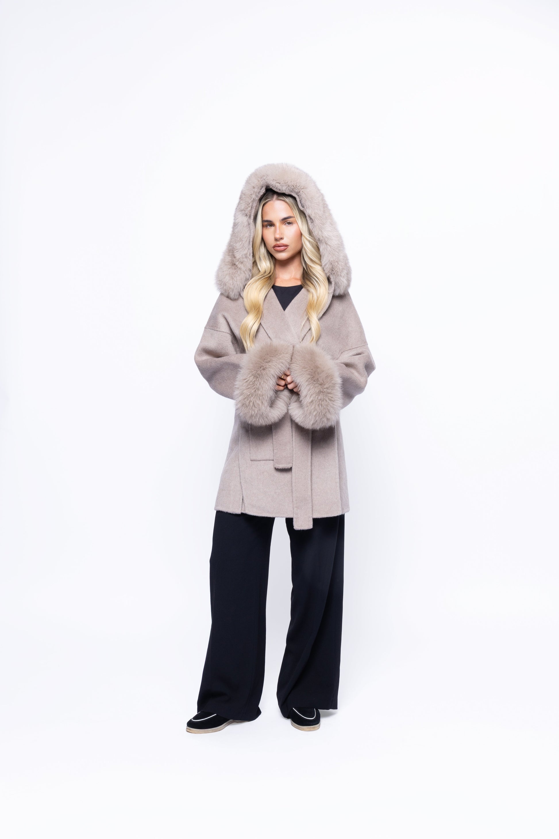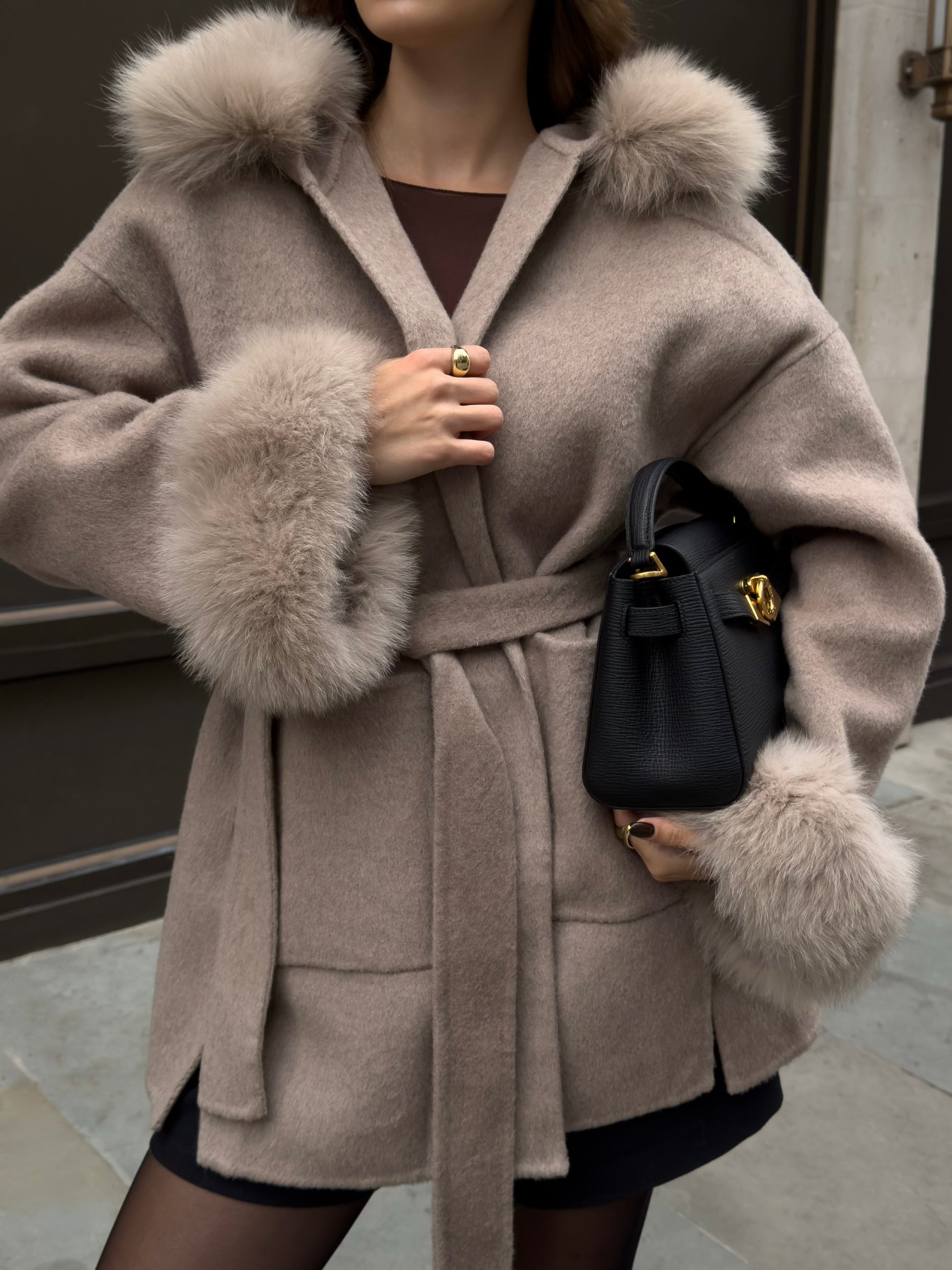 Why wear your heart on your sleeve when you can wear the most luxurious of furs on them! - 100% Wool - Short Coat - Luxury Detachable fox fur cuffs - Detachable Belt - Style your coat in 3 ways depending on your mood with detachable fur cuffs and belt. Please note due to the nature of the fur there is a chance for slight colour differences